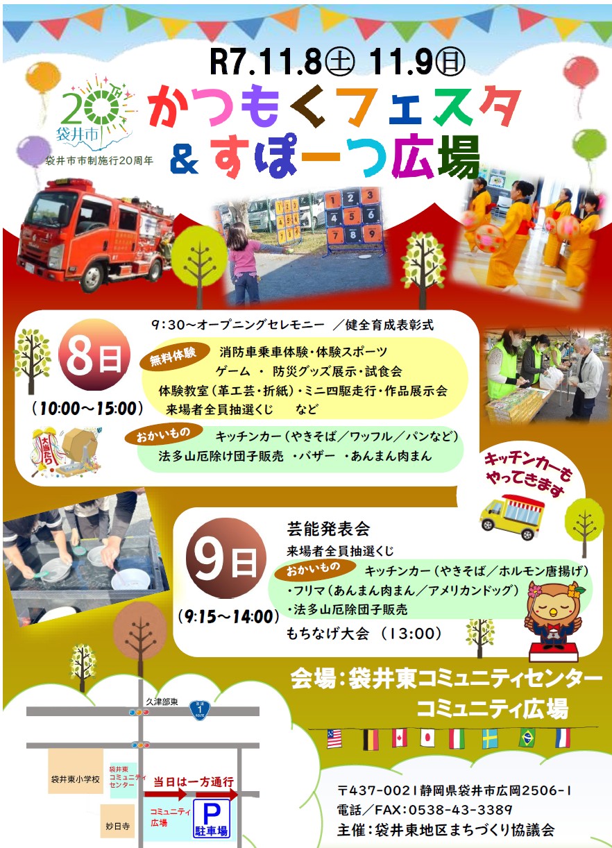 令和7年11月8日(土)、9日(日) 「かつもくフェスタ&すぽーつ広場」を袋井東コミュニティセンターにて開催します。 どなたでも楽しめるイベントになっていますので、お友達やご家族と一緒に、どうぞお気軽にお越しください。