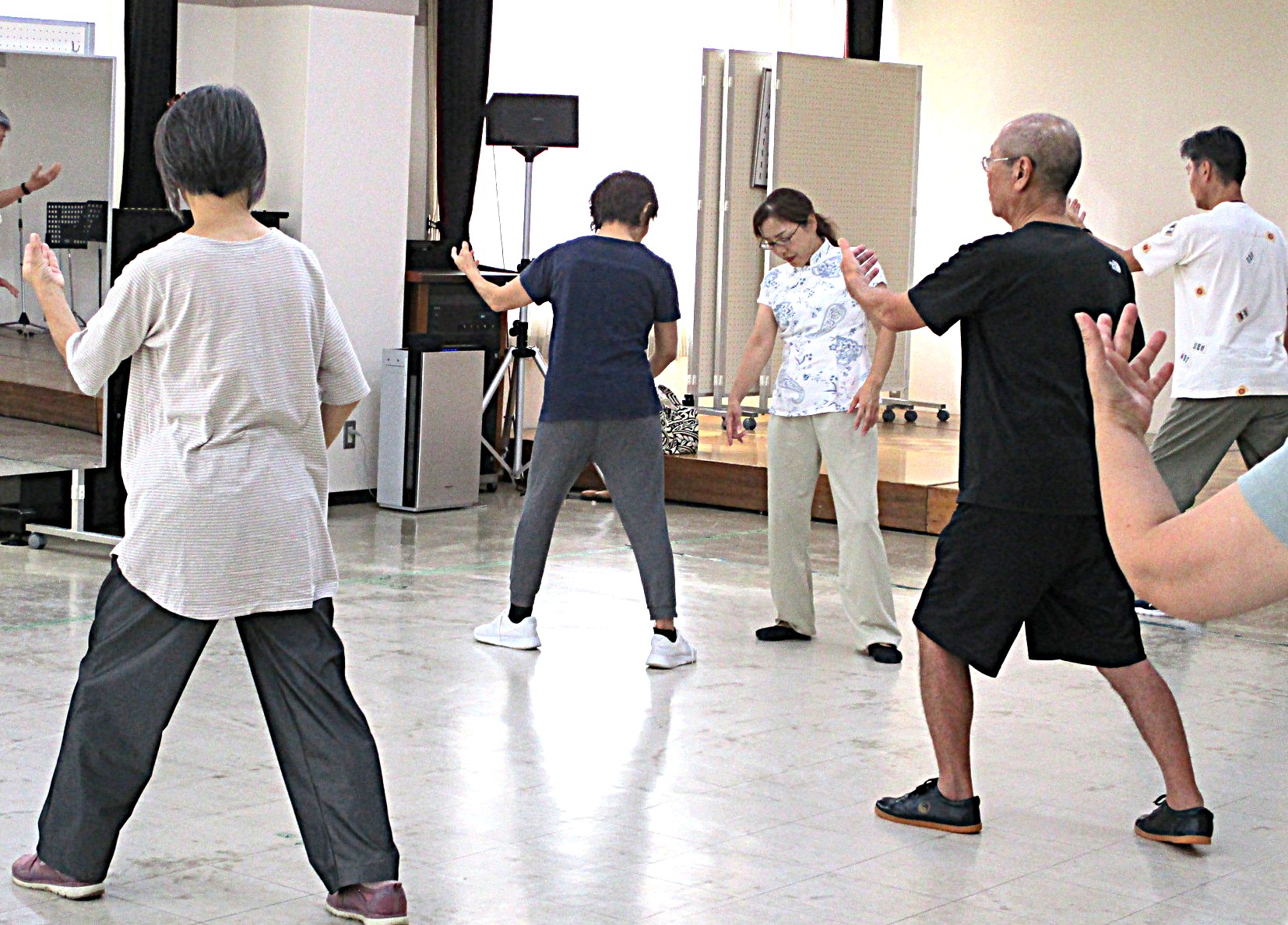 飛び切り暑い夏に始まったこの講座、先生が流してくれる涼しげな音楽に合わせ、まずは気功体操で体をほぐし呼吸法を学びます。皆さん、暑さも忘れて真剣です。そして、24式太極拳の基本動作の一部も教えていただきました。