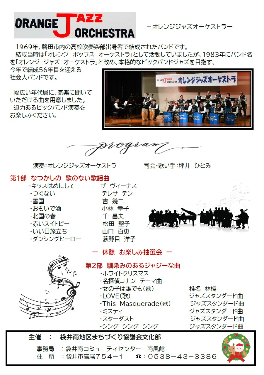 オレンジジャズオーケストラが贈る迫力のビッグバンドサウンド! さらにコンサートの途中には、うれしいプレゼントが当たる抽選会も開催! 音楽とワクワクを詰め込んだひとときをお楽しみください。 🎄開催日時🎄2025年12月14日(日) 開場9:30 開演10:00 🎄会 場🎄袋井南コミュニティセンター 袋井中央ホール 🎄入 場 料🎄無料