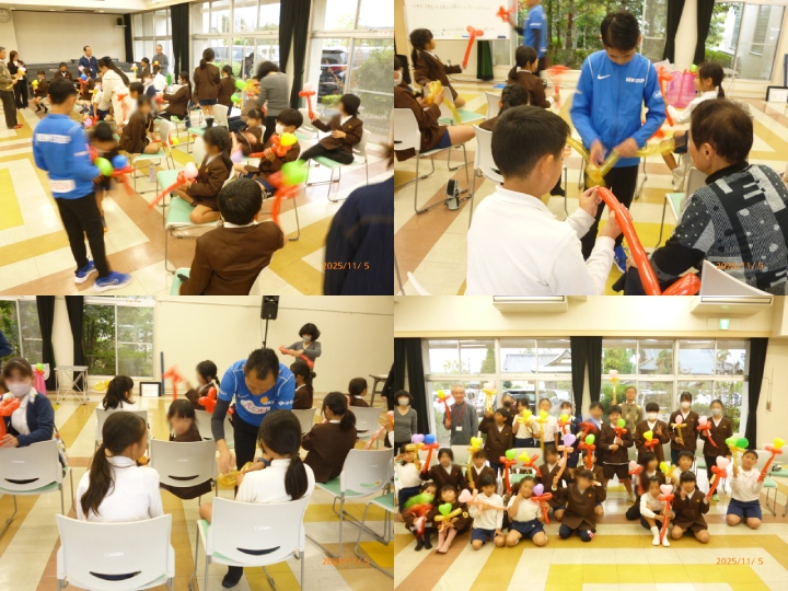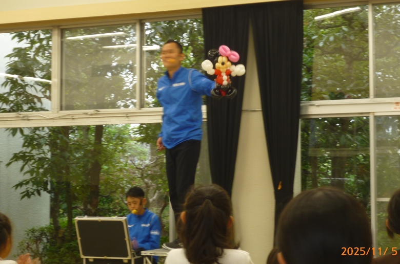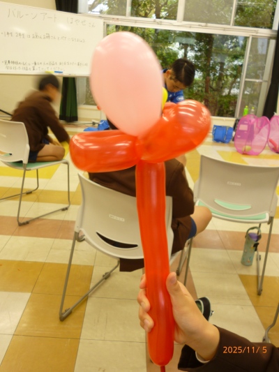 ショーの最後は、初心者向けのバルーンアート作りの説明を受け、子どもたちは風船を使い、ねじったり形を作ったりと、少し難しい作業にも一生懸命挑戦していました。