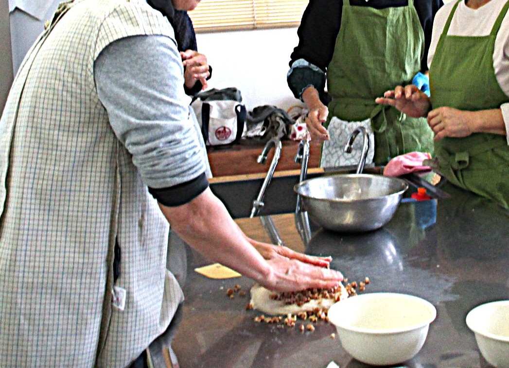 初回は、基本のあんぱんと甘納豆を入れた豆パンづくり。国産小麦をつかって手ごねで生地をつくります。二度の発酵の間に生地の分割や丸め方などを教えていただき、いよいよオーブンへ。
