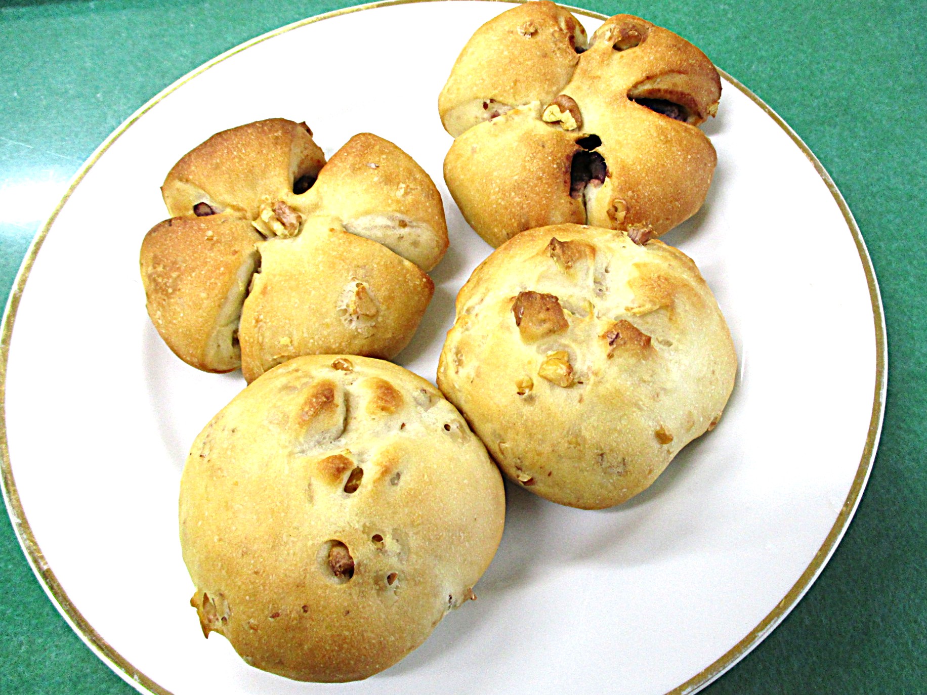 くるみあんぱんは4か所に切り込みを入れ、クルミクリチはハサミで中央を十字にカット。 お店でよく見かけるかたちとなって、くるみがゴロゴロ入った食べ応えのあるパンが完成しました!