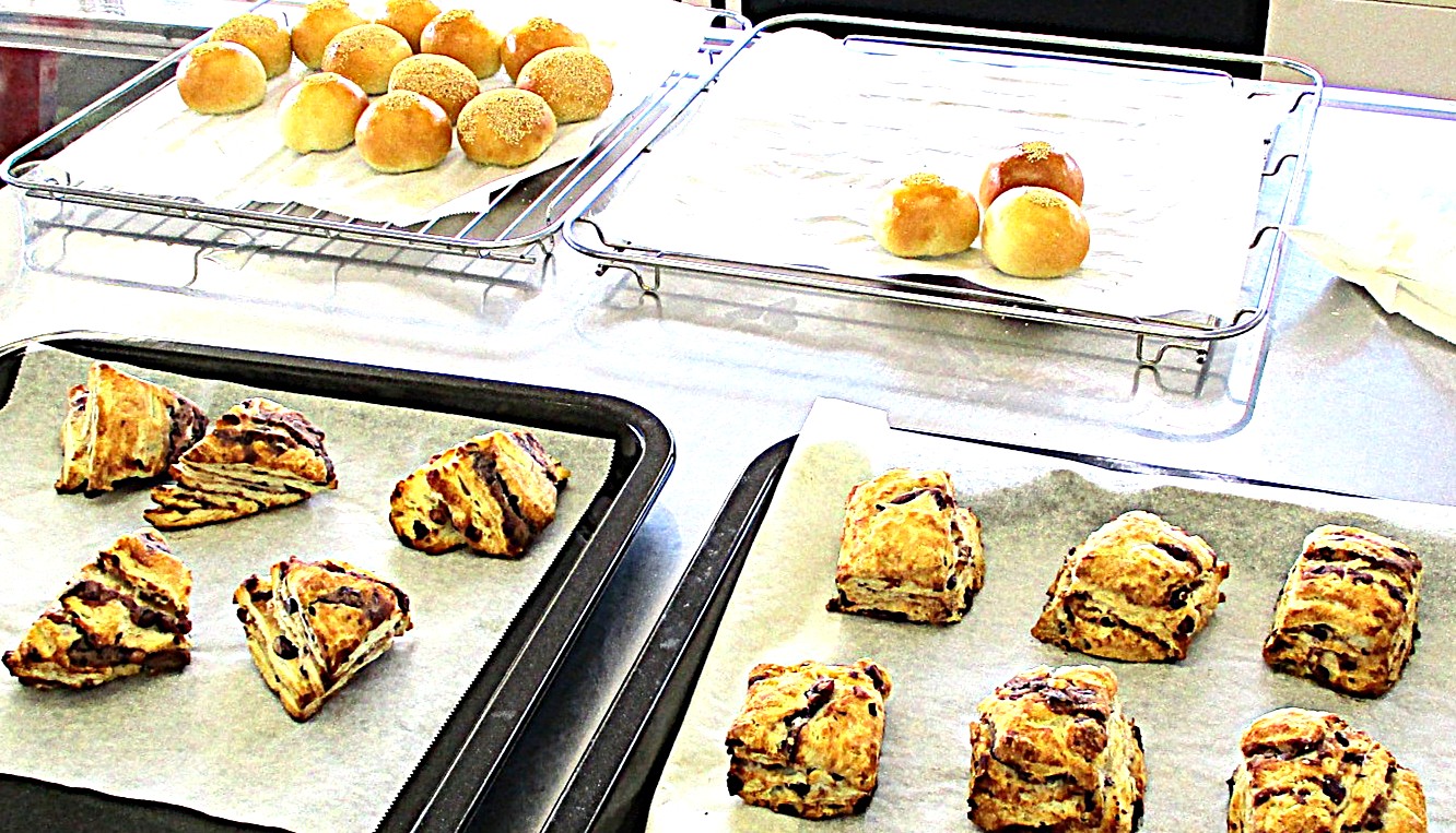 最終回は、あんを使ったちょっと珍しいパンづくり。白味噌風味の京都の和菓子「松風」を模した「松風パン」は、生地に白味噌を含ませ餡をつつみます。小倉餡のスコーンはまさに和洋折衷、餡と生地の層が交互に表れます。