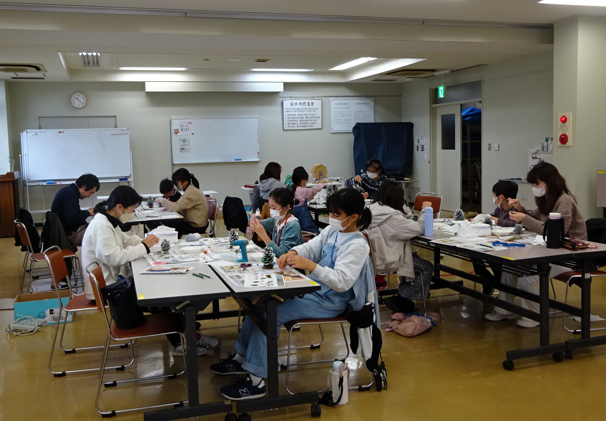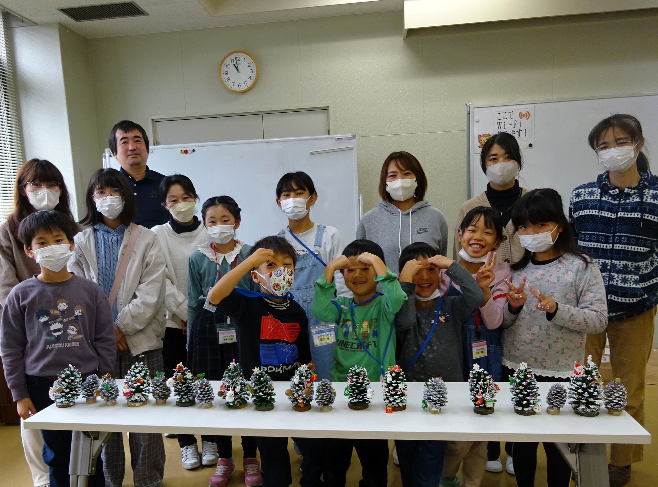 12月14日(日曜日)、少年少女学級の学級生9名が、浅羽北コミュニティセンター会議室にて、保護者の方々と一緒に松ぼっくりのクリスマスツリー作りを行いました。