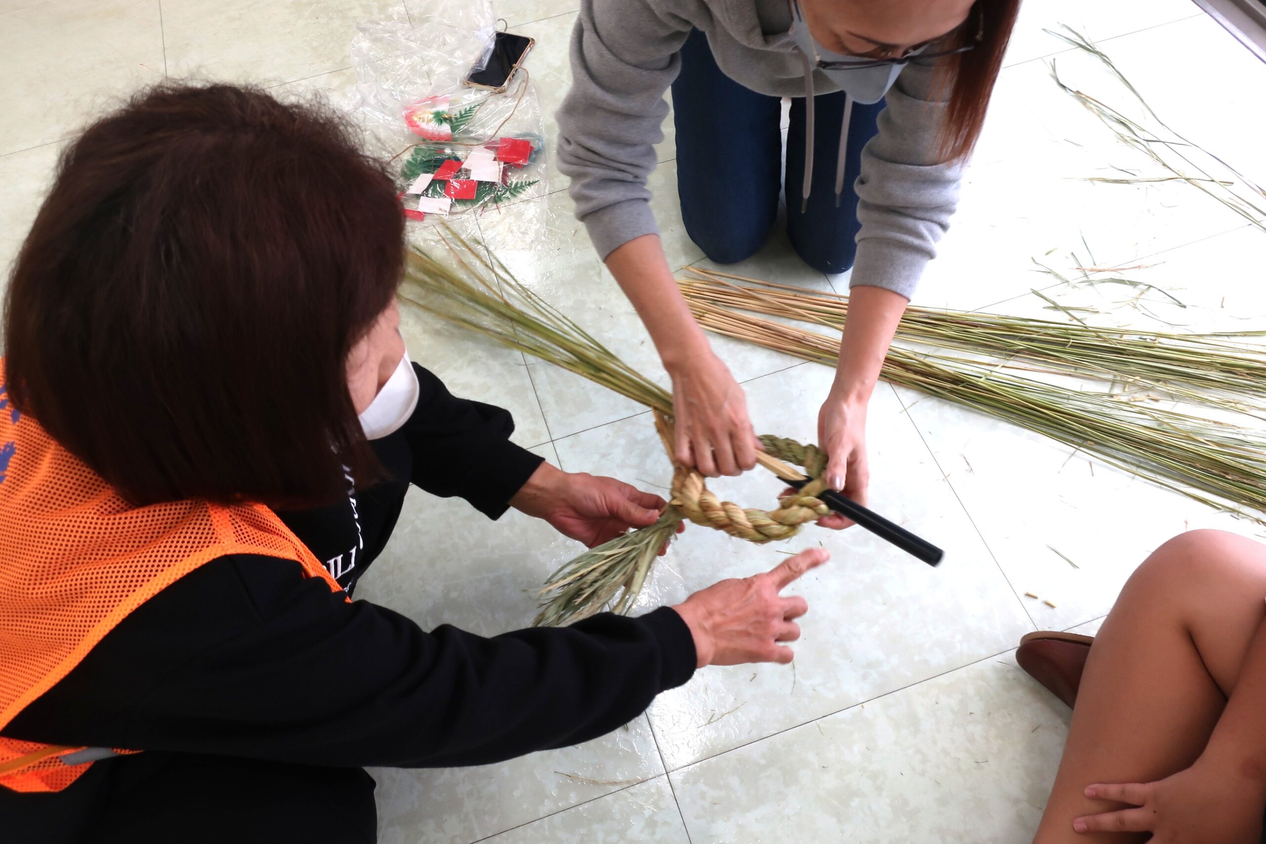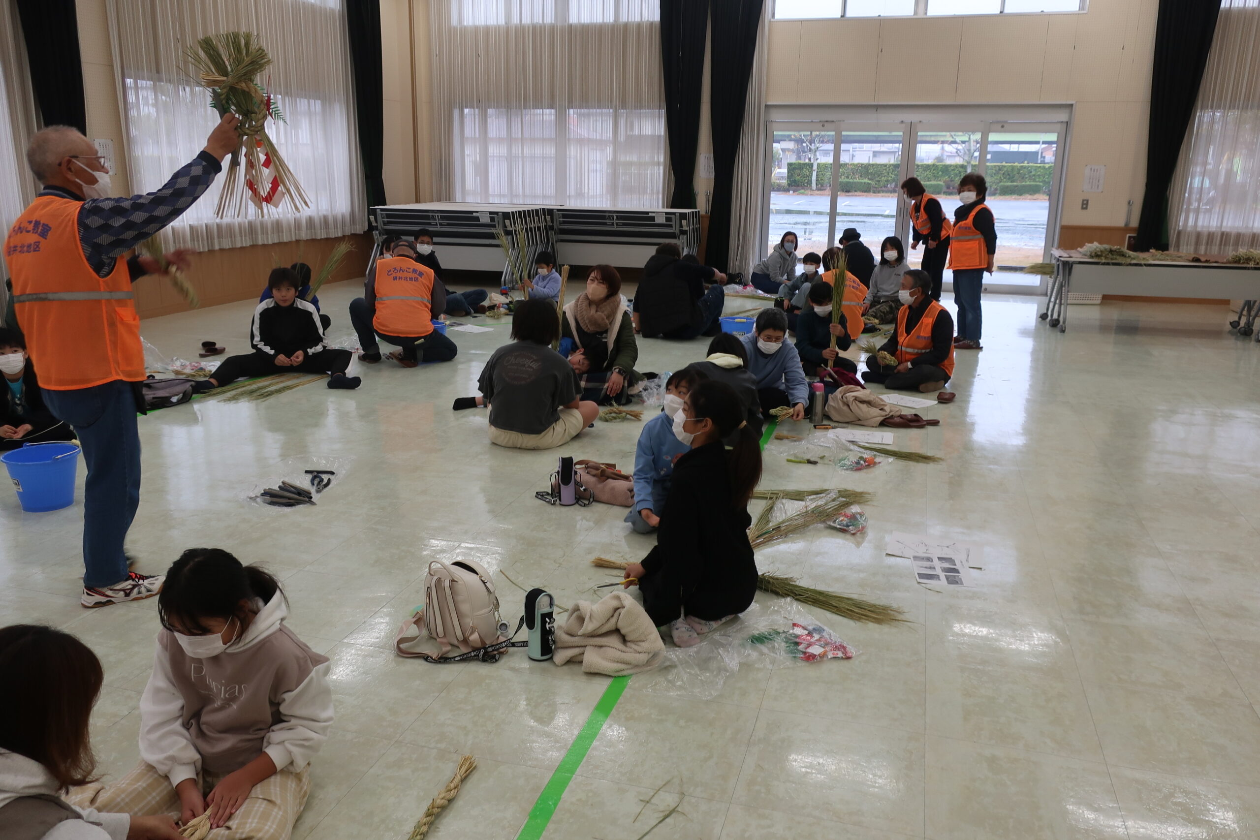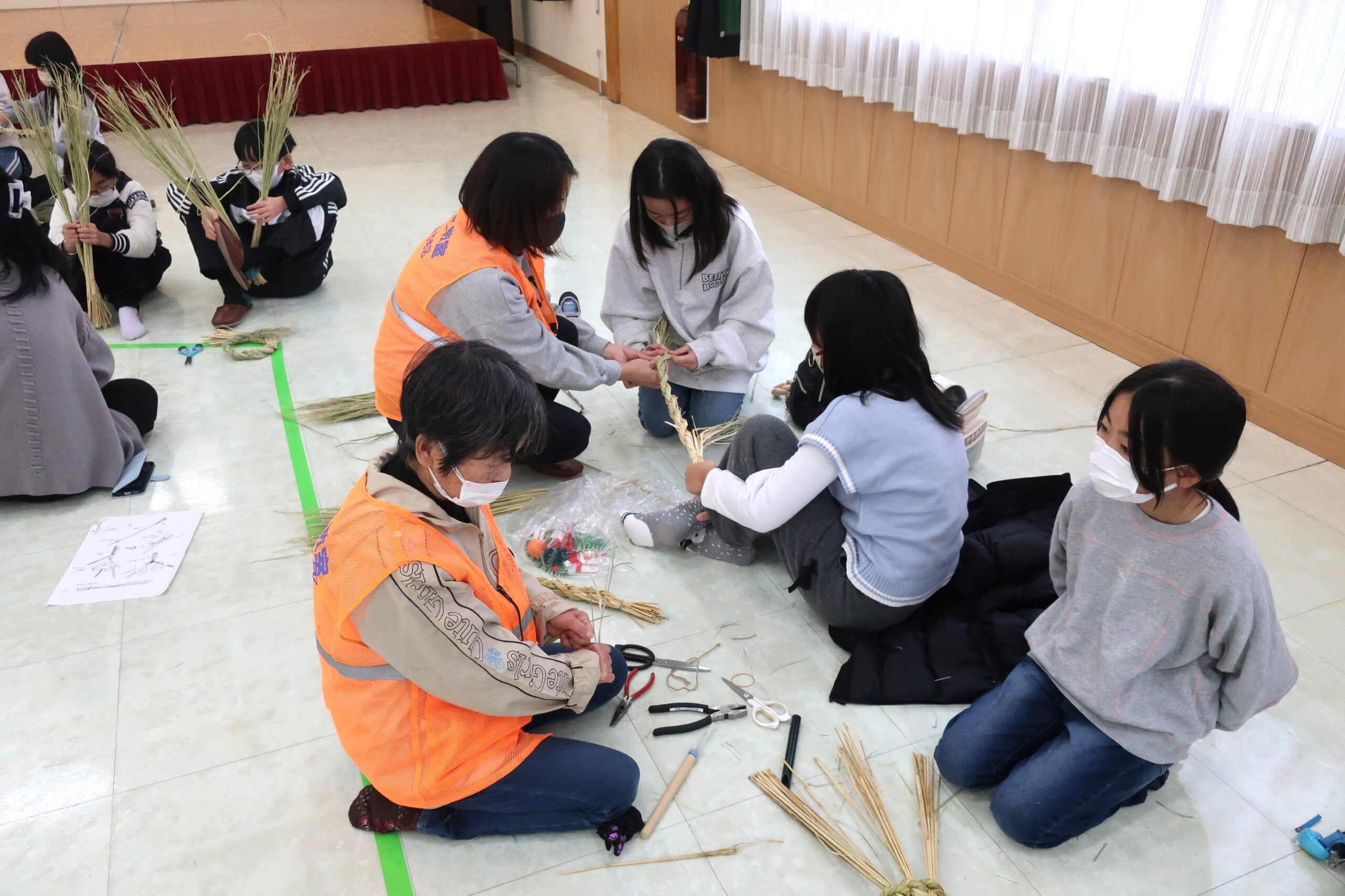 どろんこ教室では、毎年新米を収穫後の藁を使い、実行委員の皆さんの指導のもと「しめ飾り作り」
