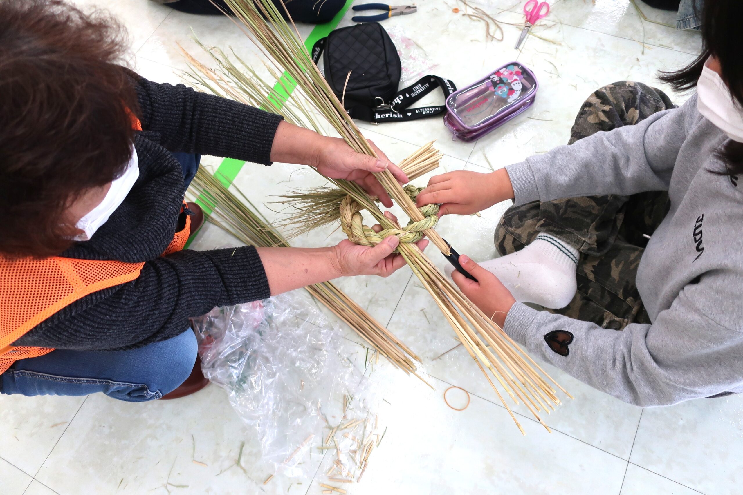この日は、あらかじめ実行委員の皆さんが用意した藁を使って、親子で協力しながら制作しました。