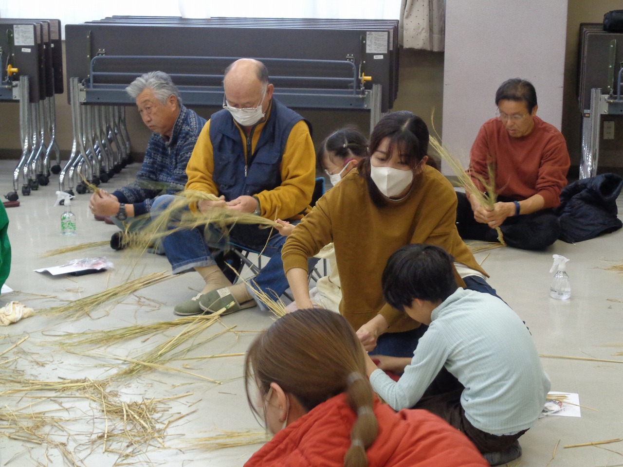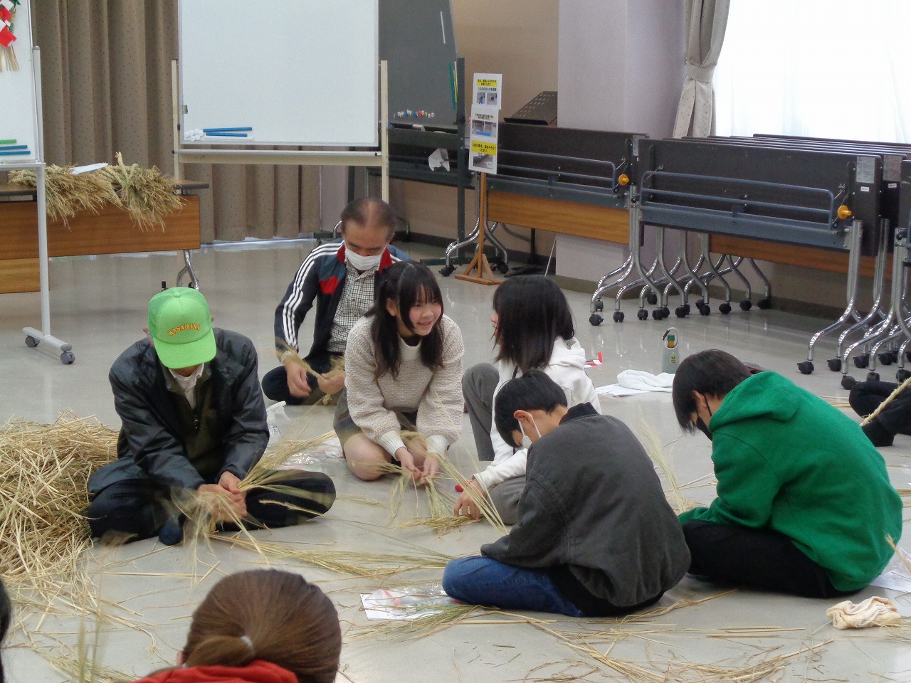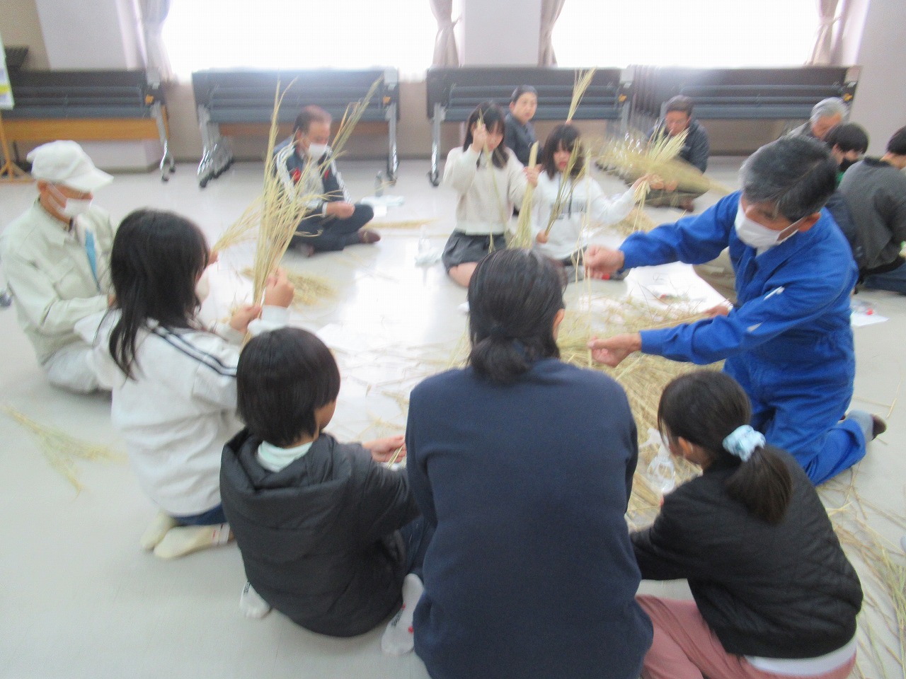 挨拶の後、稲わらの袴とりと縄ないを体験しました。左になっていくのがとても難しく、なかなかきれいな縄にならず苦労していました。