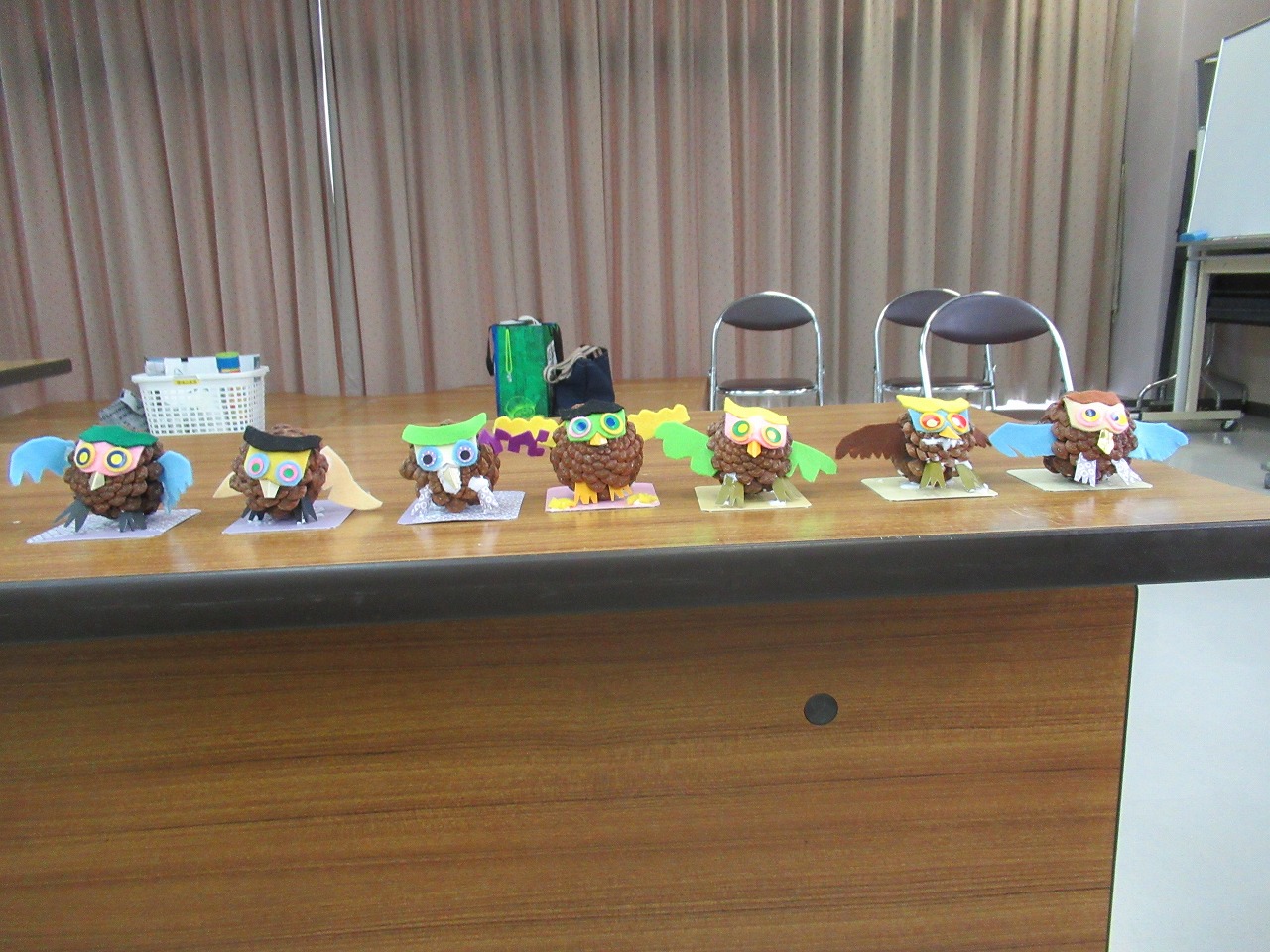 市の環境政策課の「出前ECO教室」の環境学習メニューから「エコ工作」を行いました。植物を使った工作で松ぼっくりで「ふくろう」を作りました。