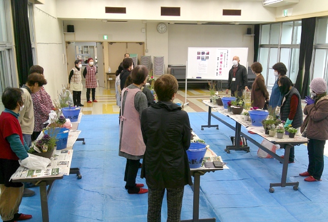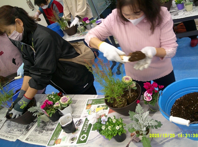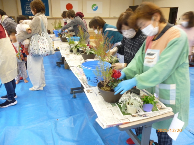 令和7年12月20日(土)の午後1時30分から、かつもく館にて地域住民30名(15名/2組/女性)が参加して正月に向けての寄せ植え教室を開催しました。