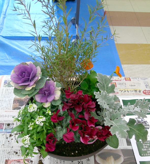 約30分の作業で、正月用の「寄せ植え」が見事に完成しました。 参加者は、玄関先に「お正月を迎える準備が出来た」と喜んでいました。